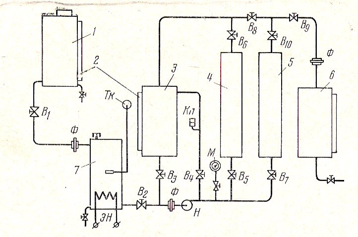 1 - бак для сырого масла; 2 – указатель уровня; 3 – промежуточный бак; 4 – адсорбер предварительной сушки; 6 – бак для сухого масла; 7 – бак для нагрева масла; ЭН – электронагреватель; Тк – контактный термометр; Н – насос; Ф – фильтр; В1-10 – вентили; Кп – предохранительный клапан; М - манометр