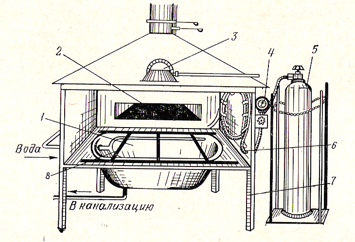 1 – бак для сырого масла; 2 – клапан; 3 и 7 – змеевики; 4 – бак водяной; 5 – бак для сухого масла; 6 – электронагреватель; 8 – окно смотровое; 9 – вентиль