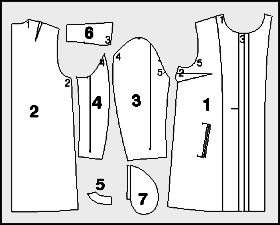 Продубльовано підборта, верхній комір, обшивку горловини спинки, листочки. На лицевій стороні пілочок з допомогою лінійки та крейди намічено лінії прорізних кишень з листочками.