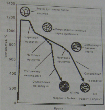 Контролируемая прокатка - разновидность термомеханической обработки, она представляет собой обработку металла давлением, регламентируемую определенной температурой окончания прокатки (~ 800 - 850°С) и заданной степенью обжатия (15 - 20%) в последних пропусках.