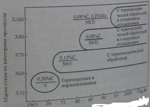 Этапы развития сталей по категориям прочности, содержанию основных элементов и видам термической обработки для магистральных трубопроводов показаны на рисунке 3.