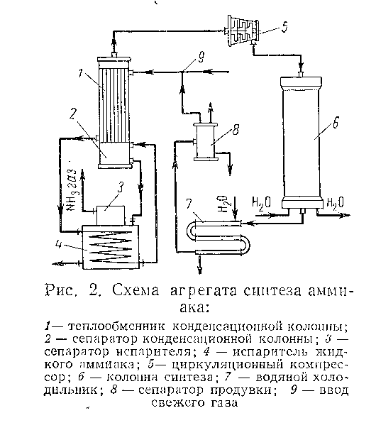 Технологічна схема установки синтезу аміаку показана на рис 2 , а також в графічній частині. Свіжий газ поступає у вхід 9 , потім разом з циркулюючим газом йде в між трубний простір теплообмінника 1 конденсаційної колони . Частково охолоджена суміш поступає в змійовик випарника рідкого аміаку 4, де повністю охолоджується та конденсується. Утворена суміш потрапляє в сепаратор конденсаційної колони , звідки газова суміш по трубному простору теплообмінника 1 йде в центробіжний циркуляційний компресор 5 (до 3МПа). Сжата до робочого тиску суміш поступає в колону синтезу аміаку 6 , а з неї у водяний холодильник 7. В сепараторі продувки 8 від суміші відділяється рідкий аміак та виводиться з циклу частина газів , що необхідно для збереження постійного складу циркулюючого газу . Газ , що повертається в цикл , змішується з свіжим газом. Виділений в сепараторі 2 конденсаційної колони рідкий аміак потрапляє в випарник аміаку 4 , та , охолодив циркулюючий газ , виводиться у частково у вигляді газу частково у вигляді рідкого аміаку . Пари води ,що могли бути присутніми у свіжій газовій суміші розчиняються у рідкому аміаку і таким чином виводяться з циклу до вступу в контакт з каталізатором.