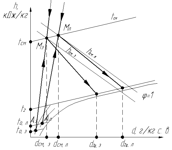Результати графоаналітичного розрахунку не співпадають з аналітичним. Це пов’язано з тим, що h-d діаграма побудована для одного значення теплоємності сухих газів та пари, а у нашому випадку вони інші. Основним же фактором отриманої відмінності є неточність побудови процесів на діаграмі.