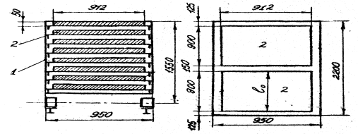 Об’єкт сушіння перебуває в піддонах з розмірами а>під >× в>під >× с>під>= =900×912×50 мм. Піддони встановлені на вагонетках, розміри яких а>в >× в>в >× × с>в >=2200×950×1500 мм. Кількість піддонів на вагонетці n>під>=30шт. Маса піддона m>під>=1 кг; маса вагонетки m>в>=100 кг. Піддони розташовані на вагонетці як це зображено на рисунку 1.