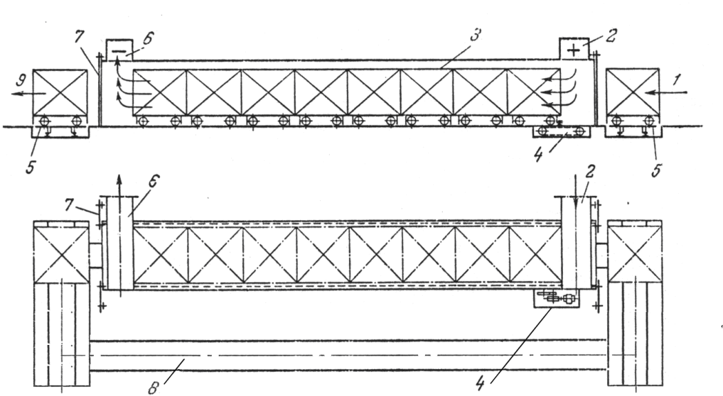 1 - вхід вологого матеріалу; 2 - вхід агента сушки; 3 - вагонетки;4 – механізм переміщення вагонеток; 5 – траверсний візок; 6 - вихід суміші, що відпрацювала; 7 – розсувні двері; 8 - обхід; 9 – вихід висушеного матеріалу.