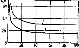 Напряжение дуги в зависимости от силы тока выражается кривыми, приведенными на рис. 5, определяющими вольтамперную или статическую характеристику дуги (1 – для дуги 3 мм; 2 – для дуги 6 мм). Приведенные кривые показывают, что при токе свыше 50 А (наиболее часто применяемых при сварке) напряжение горения дуги почти не зависит от силы тока и определяется длиной дуги.
