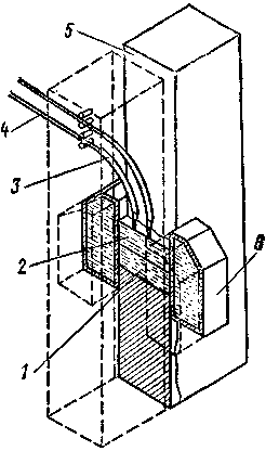 В перегретом шлаке 2 (рис. 9) расплавляется электродная проволока 4 и оплавляются свариваемые кромки 5 заготовки, металл сливается в общей сварочной ванне / и по затвердевании образует сварной шов. Медные ползуны 6, охлаждаемые водой, по мере наплавления шва автоматически перемещаются вверх и обеспечивают формирование шва. На рис. 9 показано вертикальное сечение шва и видна лишь одна свариваемая часть заготовки (вторая очерчена штрихами). Зазор устанавливается в пределах 20 - 25 мм для свободного прохода направляющих 3 с электродной проволокой. Сварку ведут одним электродом (проволокой) или несколькими в зависимости от толщины заготовки на стыке.
