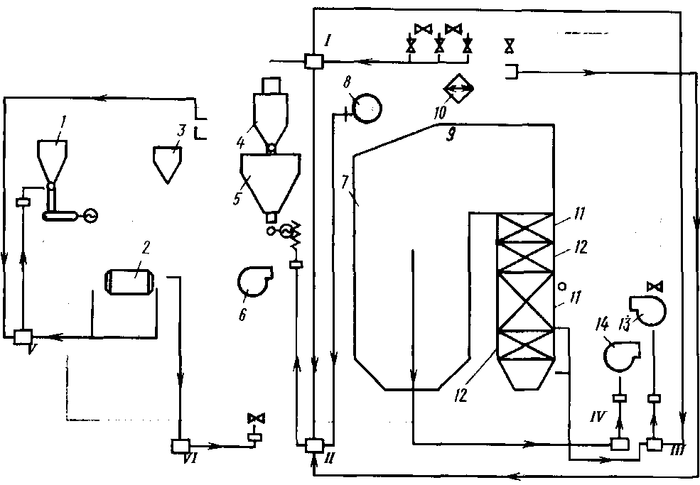 Регулирование процесса горения в топке котла (в соответствии с расходом пара) осуществляется регуляторами подачи топлива II, воздуха III и регулятором тяги IV (см. рис 3.22). Регуляторы подачи топлива II и воздуха III управляются датчиком изменения давления перегретого пара I, а регулятор тяги IV – датчиком изменения разрежения в топке 7 котла.
