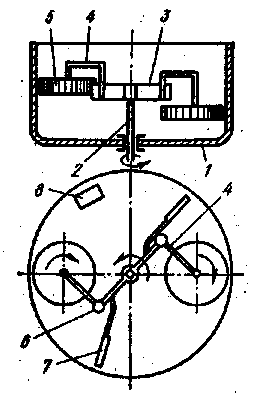 Рис. 2. Змішувальні бігуни з горизонтальними катками: — чаша; 2 — вертикальний вал; 3 — траверси; 4—маятники; 5—катки; 6 —шарніри; 7 —плужки; 8 — люк для видалення суміші