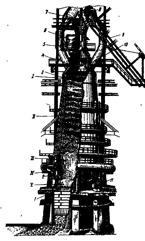 Опишіть будову і принцип роботи доменної печі і вкажіть, які фізико-хімічні процеси протікають в різних зонах печі