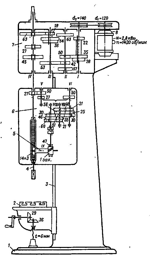 1 — фундаментна плита, 2 — піднімальний стіл; 3 — станина (колона); 4 — шпиндель; 5 — механізм подачі, 6 — коробка подач; 7 — коробки швидкостей; 8 — електродвигун