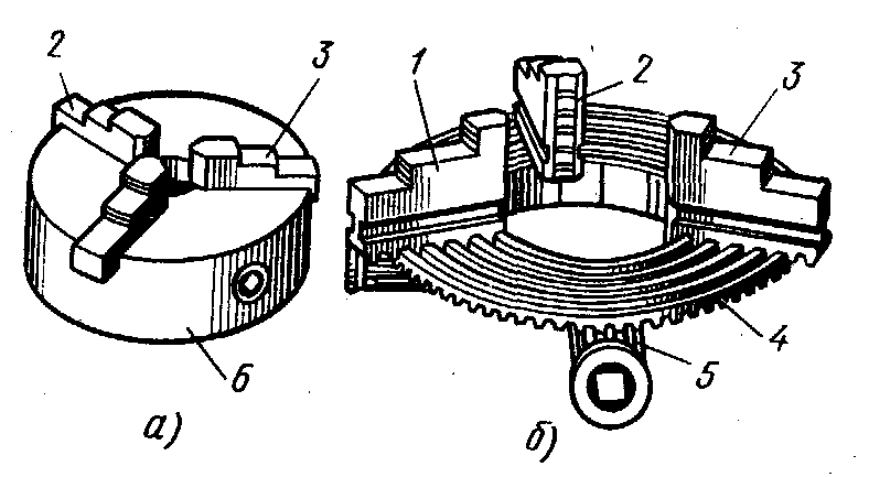 На одной стороне этого диска выполнены пазы (имеющие форму архимедовой спирали), в которых расположены нижние выступы кулачков, а на другой — нарезано коническое зубчатое колесо, сопряженное с тремя коническими зубчатыми колесами 5. При повороте ключом одного из колес 5 диск 4 (благодаря зубчатому зацеплению) также поворачивается и посредством спирали перемещает одновременно и равномерно все три кулачка по пазам корпуса б патрона. В зависимости от направления вращения диска кулачки приближаются к центру патрона или удаляются от него, зажимая или освобождая деталь. Кулачки обычно изготовляют трехступенчатыми и для повышения износостойкости закаливают. Различают кулачки крепления заготовок по внутренней и наружной поверхностям; при креплении по внутренней поверхности заготовка должна иметь отверстие, в котором могут разместиться кулачки. Кулачковые патроны могут оснащаться механизированным приводом тяговым или встроенным.