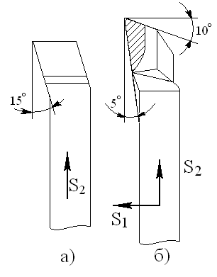 Подрезной резец а) предназначен для обработки наружных торцевых поверхностей. При подрезании торца подача резца осуществляется перпендикулярно оси обрабатываемой детали. Подрезной резец б) позволяет обрабатывать различные торцевые и другие поверхности с продольной и поперечной подачами. Рисунок 3 – подрезной резец