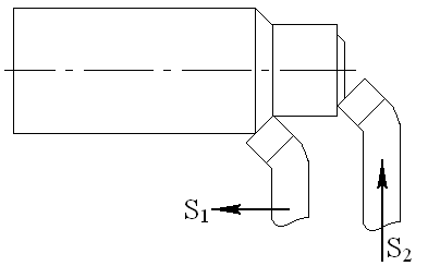 Проходным отогнутым резцом можно выполнять подрезку торца при поперечной подачи s1 и обтачивание при продольной подаче s2 резца.