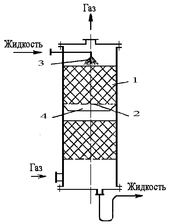 Насадочный абсорбер состоит из колонны, в которой помещены поддерживающие решетки, на которые уложены слои насадки. Орошающая жидкость подается на насадку при помощи распределительного устройства. Иногда насадку укладывают несколькими слоями, устанавливая под каждым слоем отдельные поддерживающие решетки. Движение газа и жидкости в насадочных абсорберах обычно осуществляется противотоком. Недостаток насадочных абсорберов - трудность отвода тепла в процессе абсорбции. Обычно применяют циркуляционный отвод тепла, используя выносные холодильники.