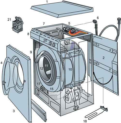 Рис. 1. Стиральная машина с фронтальной загрузкой белья: 1 — верхняя крышка; 2 — задняя стенка корпуса; 3 — передняя стенка; 4 — загрузочный люк; 5 — блок электромагнитных клапанов; 6 — шланг залива воды; 7 — дозатор моющих средств; 8 — бункер дозатора; 9 — резиновый патрубок; 10 — бак; 11 — барабан; 12 — уплотнитель люка; 13 — пружина подвески бака; 14 — амортизатор; 15 — противовес; 16 — прессостат; 17 — сливной насос; 18 — нагревательный элемент (ТЭН); 19 — электромотор; 20 панель управления; 21 — командоаппарат