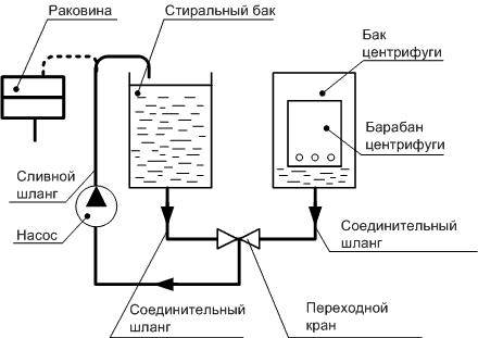 Рис. 3 Гидравлическая схема двухбаковых стиральных машин с одним насосом и переходным краном