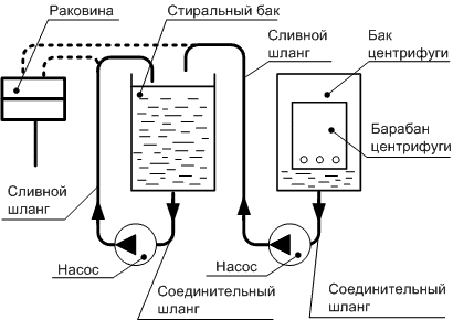 В машине с двумя насосами (рис.1) один насос работает от электродвигателя привода центрифуги и откачивает моющий раствор из бака центрифуги, а второй работает от двигателя привода активатора и обеспечивает циркуляцию моющего раствора или откачку его из стирального бака. По два насоса имеют, например, стиральные машины ПЧЕЛКА и ВОЛГА.