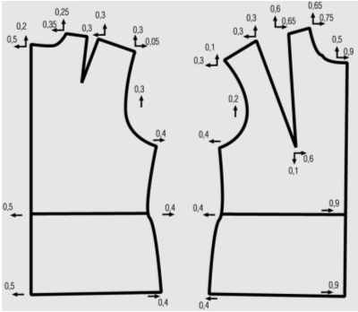 Наприклад, надбавка до напівобхвату грудей в 44 і в 54 розмірах буде однакова. В процесі градації рукава ми прагнемо до збереження норми посадки, а не надбавки до ширини рукава, а в деталях спинки і полички просто нехтуємо такими величинами.