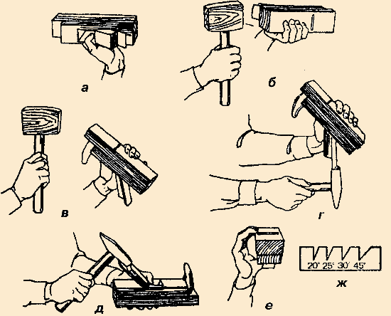 При русі інструмента назад частину колодки трохи піднімають, щоб не затупляти лезо. Торці і сучковиті місця стругають подвійним рубанком, шліхтиком, тримаючи їх під кутом "від себе" (див. рис. 11, в) і "на себе" (див. рис. 11, д).