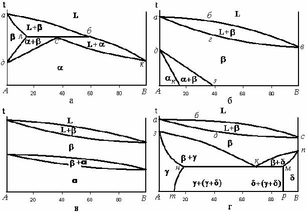 Рис. 7. Діаграми стану сплавів з поліморфними перетвореннями.