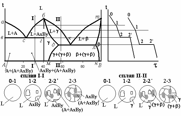 В залежності від кількості хімічних сполук, що можуть утворюватись діаграма може розділятися на декілька діаграм твердих розчинів або механічних сумішей в залежності від процесу взаємодії хімічних сполук з компонентами А і В. Розглянемо структури, що утворюються на прикладі діаграми стану, зображеної на рис 4.6.