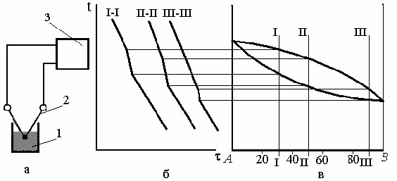 Побудова діаграм стану основана на фіксації характерних точок сплаву, що мають місце при його охолодженні (рис. 1). Для чого в сплав (1), що охолоджується поміщається термопара (2) і спеціальним приладом (3) проводиться запис температури в процесі охолодження сплаву. Аналогічний процес проводиться для декількох складів сплаву. При зміні фазового складу сплаву на кривій зниження температури, в залежності від числа ступенів свободи, буде спостерігатися перегин (рис. 4.1.б), або горизонтальна лінія. Відповідні температури, при яких проходять такі зміни наносяться на вертикальну лінію, яка на діаграмі стану показує склад нашого сплаву. Провівши подібні виміри для декількох сплавів різного складу (рис. 4.1.в) та з’єднавши відповідні точки, отримаємо діаграму стану для подвійних сплавів компонентів А і В.