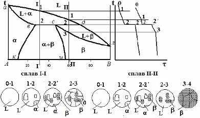 В області алб з рідини починається виділення кристалів твердого розчину компоненту В в високотемпературній модифікації Аb (b), область адл – область існування b- твердого розчину. Нижче лінії дл починається перебудова кристалічної гратки в низькотемпературну модифікацію Аa і область длс буде складатись з двох типів кристалів твердих розчинів a і b. Нижче лінії дск буде однорідний a- твердий розчин.