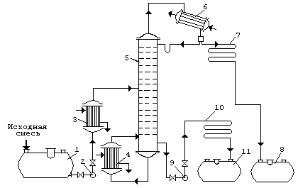 Рисунок А 1- Принципиальная схема ректификационной установки -1ёмкость для исходной смеси; 2, 9- насосы; 3- теплообменник-подогреватель; 4 - кипятильник; 5- ректификационная колонна; 6- дефлегматор; 7- холодильник дистиллята; 8- ёмкость для сбора дистиллята;