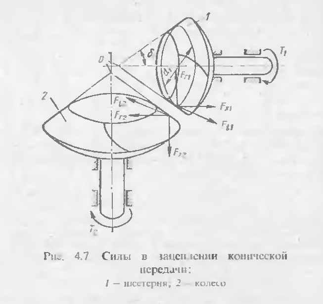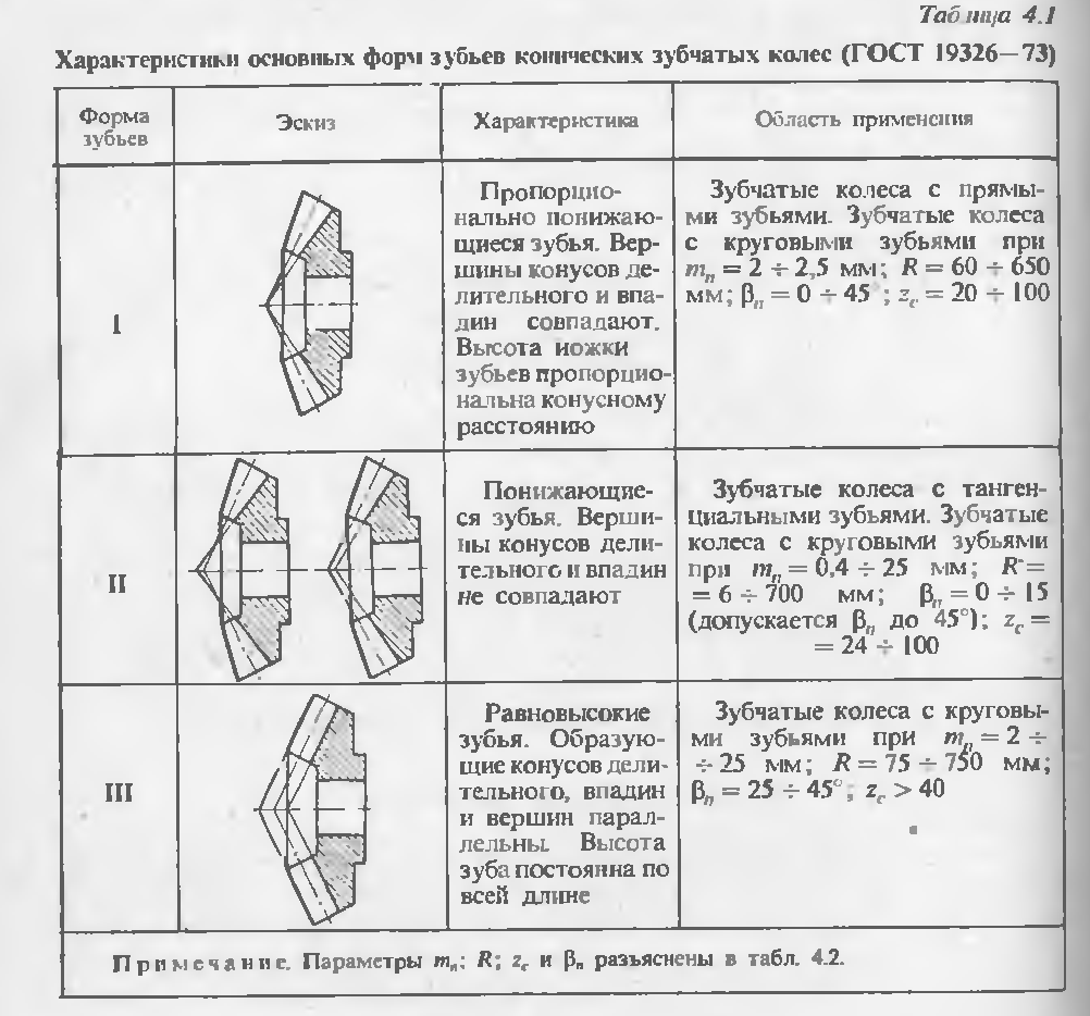 Конические зубчатые колеса применяют в передачах между валами, оси которых расположены под углом. Основное применение имеют передачи с пересекающимися под углом 90° осями, т. е. ортогональные передачи, которые рассматриваются ниже. Передачи с межосевым углом, не равным 90°, применяют редко из-за сложности форм и технологии изготовления корпусных деталей, несущих эти передачи, хотя для изготовления самих колес межосевой угол передачи не имеет значения. Пересечение осей валов затрудняет размещение опор. Одно из конических колес, как правило, располагают консольно. При этом увеличивается неравномерность распределения нагрузки по длине зуба. В коническом зацеплении действуют осевые силы, наличие которых усложняет конструкцию опор. Все это приводит к тому, что по опытным данным нагрузочная способность конической прямозубой передачи составляет лишь около 0,85 цилиндрической. Несмотря на отмеченные недостатки, а также то, что конические колеса сложнее, чем цилиндрические в изготовлении и монтаже, конические передачи имеют, широкое применение, поскольку по условиям компоновки механизмов довольно часто необходимо располагать валы под углом. Конические колеса выполняют с прямыми, тангенциальными, круговыми и другими криволинейными зубьями