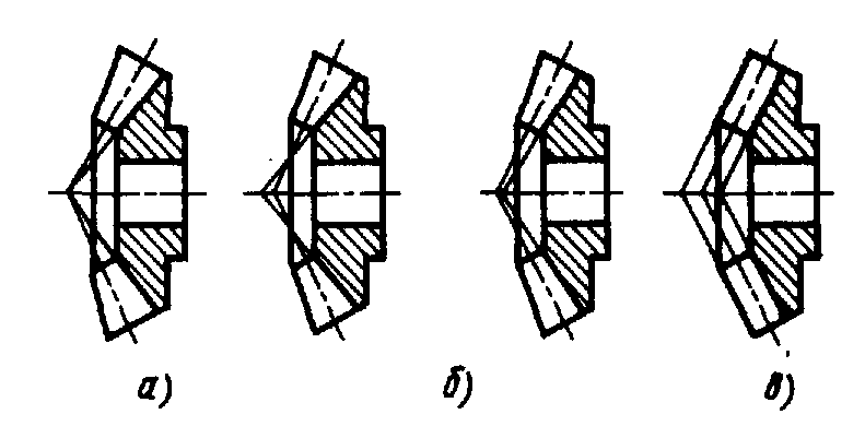 Прямозубые конические колеса следует применять при невысоких окружных скоростях (до 2...3 м/с) как наиболее простые в монтаже (допустимо до 8 м/с). При более высоких скоростях целесообразно применять колеса с круговыми зубьями, как обеспечивающие более плавное зацепление, меньший шум, большую несущую способность и более технологичные. Зубья обрабатывают на специальных станках для нарезания конических колес. В массовом и крупносерийном производстве в связи с возможностью компенсации при нарезании зубьев последующих закалочных деформаций конические колеса не шлифуют, а ограничиваются притиркой. В конических передачах для обеспечения при сборке правильного контакта зубьев предусматривают возможность осевой регулировки зубчатых колес. Несущая способность конических зубчатых передач с повышенным перекосом осей (от консольного расположения, недостаточной жесткости валов и корпусов) может быть несколько повышена даже по сравнению с передачами, имеющими круговой зуб, выполнением зубьев двояковыпуклыми и вогнутыми. Обе стороны зуба шестерни нарезают выпуклыми, а колеса — вогнутыми. Выигрыш получается вследствие того, что удельная жесткость пары зубьев не меняется по длине зубьев и пятно контакта при деформации валов не смещается.