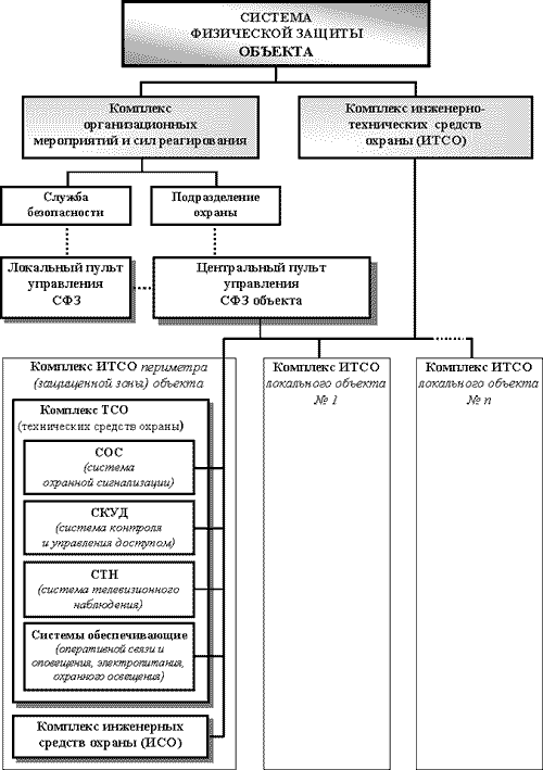 "Система физической защиты" (СФЗ) представляет собой совокупность правовых норм, организационных мер и инженерно-технических решений, направленных на защиту жизненно-важных интересов и ресурсов предприятия (объекта) от угроз, источниками которых являются злоумышленные (несанкционированные) физические воздействия физических лиц - нарушителей (террористов, преступников, экстремистов и др.). В этом едином комплексе задействованы и люди (служба безопасности, силы охраны), и техника - комплекс инженерно-технических средств охраны (ИТСО) или комплекс инженерно-технических средств физической защиты (ИТСФЗ). От их четкого взаимодействия зависит эффективность СФЗ. Укрупненная структурная схема типовой СФЗ приведена на рис. 1.
