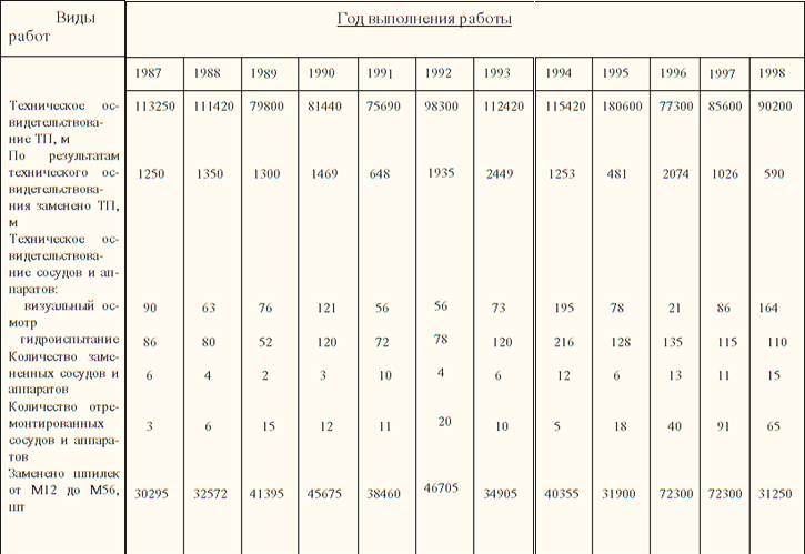 Только в 1998 г. проведено освидетельствование 465 аппаратов, контрольная диагностика 52 аппаратов и 3000 м трубопроводов. По результатам этих работ произведена замена 19 аппаратов, проведен ремонт 162 аппаратов, на которых отремонтировано 454 штуцера.