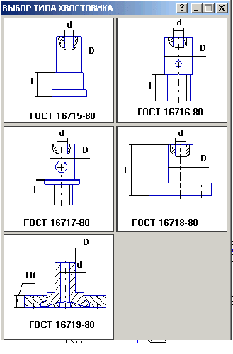 Добавляем в проект узел «Дополнительные детали». В «Дополнительные детали» «Хвостовик». Нажимаем кнопку «Проектирование Хвостовик». Установка на плане верха. Из слайдового меню выбираем тип хвостовика – по ГОСТ 16718-80. Из меню для определения способа установки хвостовика выбираем команду «В центре оси штампа» и хвостовик автоматически отрисовывается в выбранной точке. Выбираем команду «Установка на главном виде». Хвостовик отрисовывается автоматически.