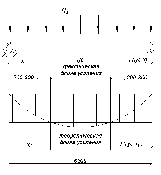 Фактическую длину элементов усиления принимаем несколько больше теоретической (на 200-300 мм с каждой стороны) для обеспечения полного включения элементов усиления в работу балки.