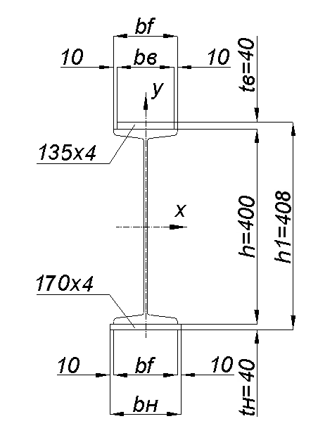 Усиление балки путем увеличения сечения проводится двумя листовыми элементами. Ширину листов принимаем различными для верхнего и нижнего пояса балки - для удобства выполнения сварочных работ. Сварка при этом выполняется в нижнем положении. Площади сечения элементов усиления для верхнего и нижнего поясов проектируем одинаковыми, чтобы центр тяжести сечения балки не смещался, нормальные напряжения от нагрузки в этом случае будут иметь наиболее рациональное распределение. Элементы усиления изготавливаем из материала с расчетным сопротивлением, близким расчетному сопротивлению материала балки.