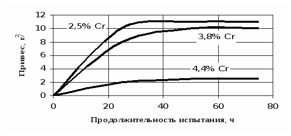 Наиболее заметное влияние на окалиностойкость, а следовательно, на износостойкость хром оказывает при содержании с 2,5 до 3,5–4% (рис. 2).