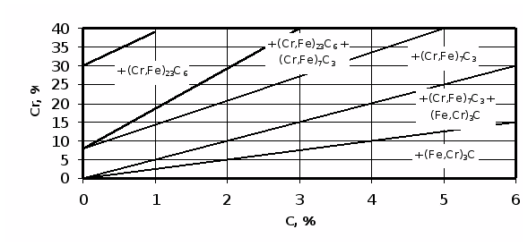 Рис.1. Сечение диаграммы состояния системы Fe – Cr – C при20оС [5]