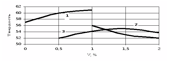 Рис. 4. Влияние ванадия на максимальный уровень вторичной твердости, достигаемый в сталях типа Х4В2М1Ф (1), 4Х4ВМФС (2) и 5Х3В3МФС (3) после отпуска при 500–550оС (закалка на зерно № 10)