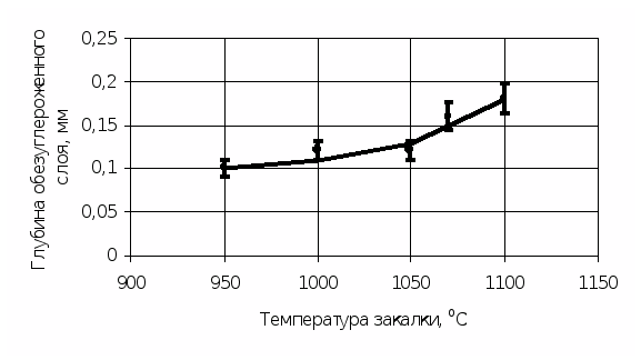 При производстве одной единицы продукции дается припуск на обезуглероженный слой 0,7 мм. В данной работе было показано, что обезуглероживание при температурах закалки до 1 100оС не превышает 0,18 мм, т.е. объемную долю снимаемого материала можно уменьшить.