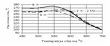 Вольфрам (и в меньшей степени молибден) задерживают коагуляцию карбидов, выделяющихся по границам зерен и некоторым кристаллографическим плоскостям, и усиливают дисперсионное твердение при отпуске, но при увеличении их содержания ухудшается вязкость. Это отрицательное влияние вольфрама значительнее его измельчающего воздействия на зерно. Вольфрам усиливает также карбидную неоднородность, из-за чего дополнительно снижаются механические свойства в крупных сечениях.