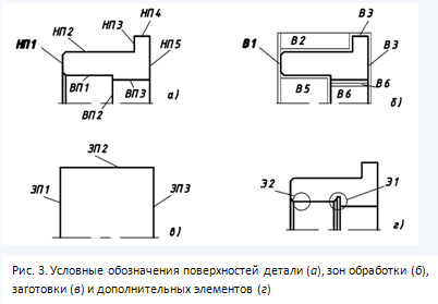 Элементы основного контура детали обозначены через НП1, НП2,…,НП5; ВП1, ВП2, ВП3 (соответственно наружный и внутренней контур), и заготовки через ЗП1,ЗП2,ЗП3.