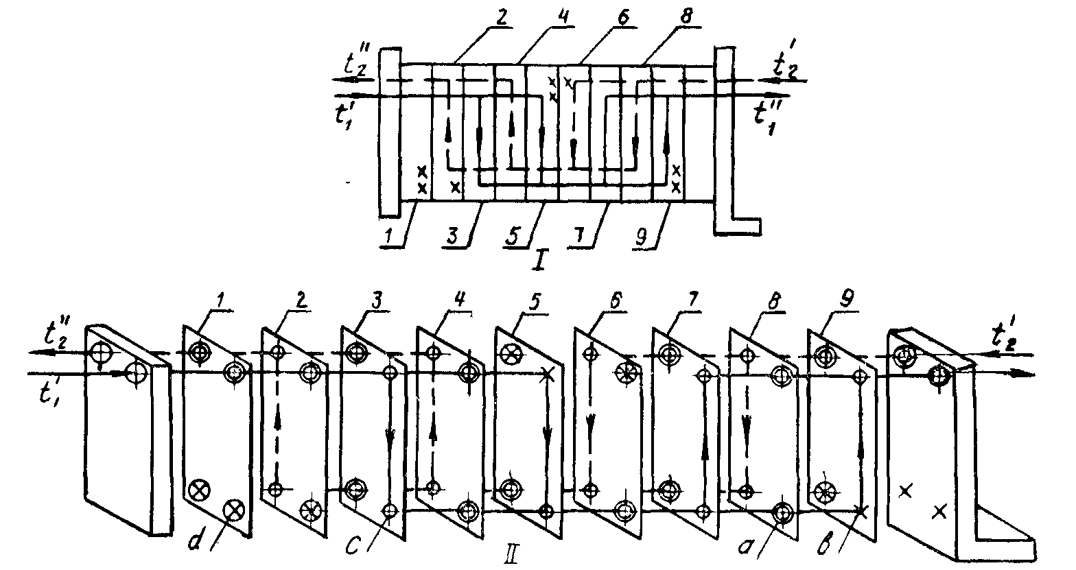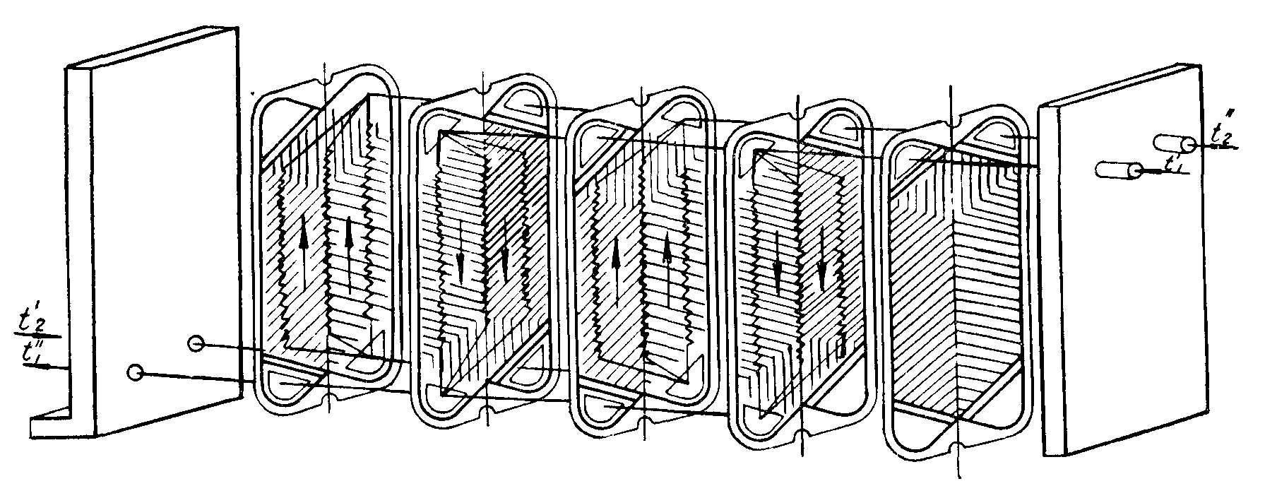 Зображеній перспективній схемі руху робочих середовищ терен теплообмінний апарат з п’яти відповідає умовна плоска схема, показана на рисунку . В реальних апаратах число пластин значно більше.
