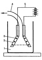 Рис.2 Устройство электропанели для плавления мазевых основ: 1-емкость с мазевой основой, 2 - воронка с фильтром и кожухом, 3 - нагревательные элементы, 4 - шланг для передачи мази в емкость, 5 - источник переменного тока.
