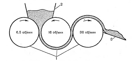 Рис.4 Трехвальцовая мазетерка: 1 - валки, 2 - бункер, 3 - направляющий желоб.