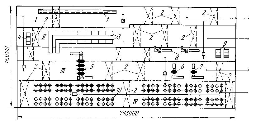 I - пролет склада горячекатаных рулонов, II - пролет НТА, III - пролет стана, IV - пролет колпаковых печей; 1 - конвейер передаточный горячекатаных рулонов, 2 - мостовые краны, 3 - непрерывно-травильные агрегаты, 4 - агрегат поперечной резки горячекатаных рулонов, 5 - рабочая линия стана, 6 - дрессировочный стан, 7 - дрессировочный стан 1700, 8 и 9 - агрегаты продольной и поперечной резки, 10 - колпаковые печи.