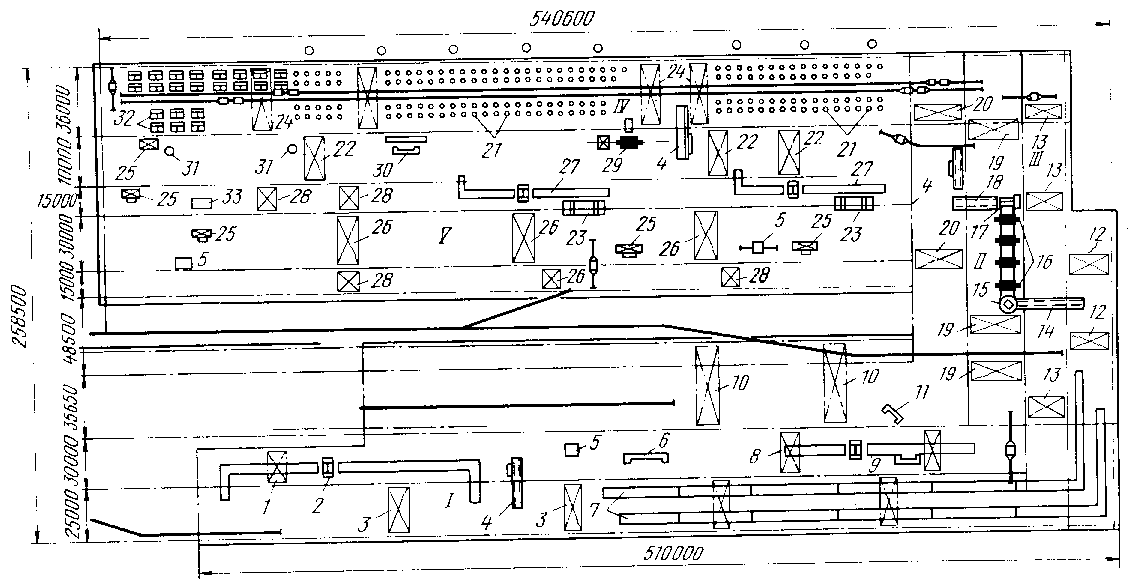 I - склад горячекатаных рулонов, II - пролет стана, III - машинный зал, IV - пролет газовых колпаковых печей, V - склад готовой продукции; 1, 3, 8, 10, 12, 13, 19, 20, 22, 24, 26, 28 - мостовые краны, 2 - агрегат поперечной резки, 4 - конвейеры передаточные с кантователями, с5 - агрегаты упаковки пачек листов, 6 - ножницы, 7 - непрерывно-травильные агрегаты (НТА), 9 - комбинированный агрегат резки, 11 - гильотинные ножницы, 14 - конвейер подачи рулонов к стану, 15 - разматыватель, 16 - рабочая линия станов, 17 - моталка, 18 - конвейер отводящий, 21 - одностопные колпаковые печи, 23 - пакетирующие столы, 25 - весы, 27 - дрессировочные агрегаты, 29 - дрессировочная клеть, 30 - агрегат продольной резки, 31 - агрегаты упаковки рулонов, 32 - двухстопные колпаковые печи, 33 - пакетировочный пресс