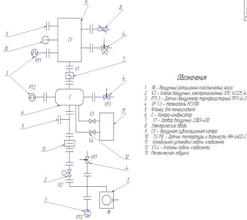 Данная работа содержит ____ страниц текста, 14 листов чертежей формата А1. Целью данной работы является разработка вакуумной сублимационной установки производительностью 45 кг по испаренной влаге за 1 рабочий цикл установки (7-9ч).