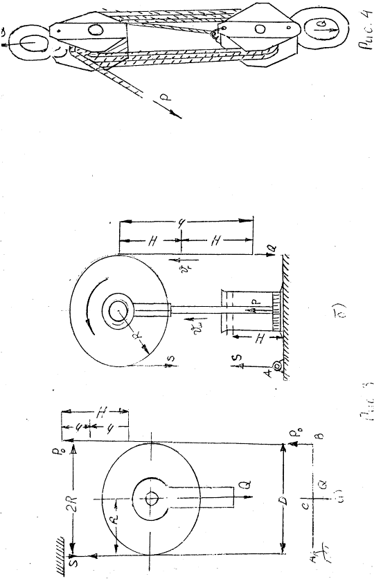 Подвижный блок для выигрыша в скорости ( рис.3,б) отличается от блока для выигрыша в силе приложением к оси его движущей силы P, в то время как груз Q подвешен на свободной ветви каната ( так называемый обращенный блок ). В этом случае путь H, проходимый силой P, будет в два раза меньше, чем путь h, проходимый грузом Q (см.рис.3,б), откуда
