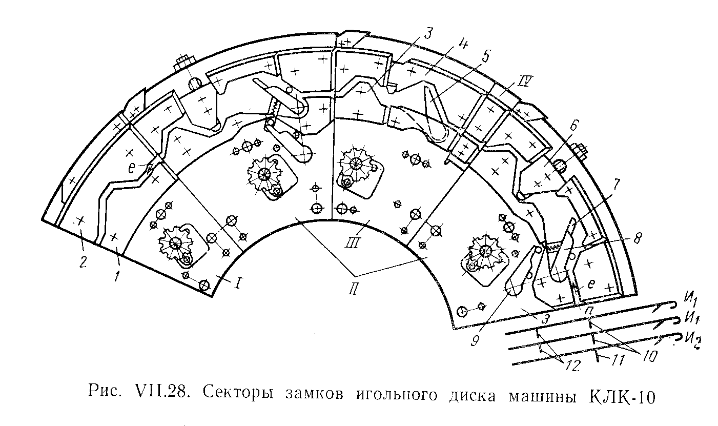 3-сектор системы сброса. Заключающий клин 5 действует на длинные пятки 11 верхнего уровня. При его включении иглы И>2> выдвигаются на уровень заключения, но т. к. в данной системе нить не подается, то при движении игл И>2> к центру диска под действием клина 4 с них производится сброс петель. Клином 3 иглы выдвигаются для открывания язычков.